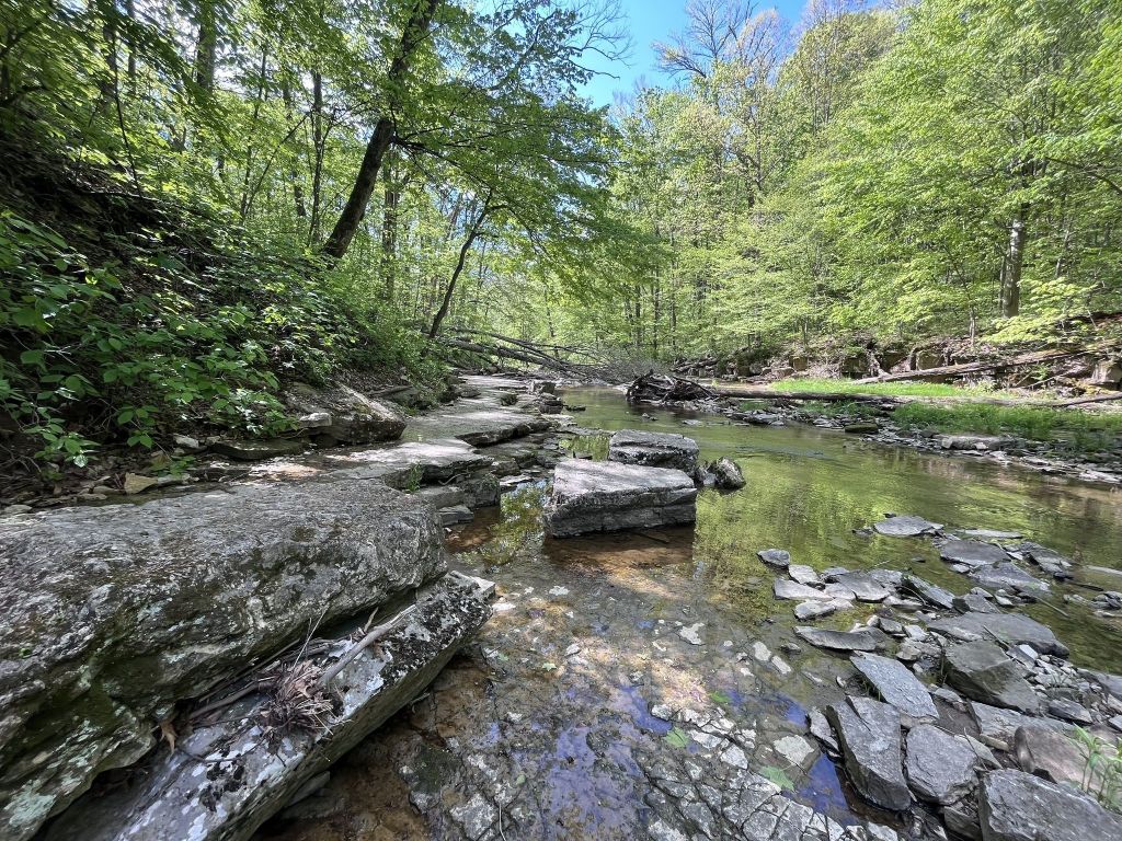 This 4.9-mile, moderate, loop takes hikers through McCormicks Creek State Park. The trail features waterfalls, creeks, forested trail, great rock formations, and wildflowers in the spring. Go early in the morning to have more solitude. Read more.