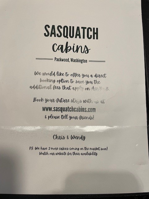 On the advice of a follower and fellow Sasquad, we checked out the Sasquatch Cabin in Packwood, WA. This place did not disappoint. It was about 20 minutes from the main gate of Mt. Rainier National Park and the drive was beautiful! You cannot beat driving through endless thick forest, with views of the mountains all around you. The cabin was great and situated in a pretty quite location. The Sasquatch decor made the adventure even better.